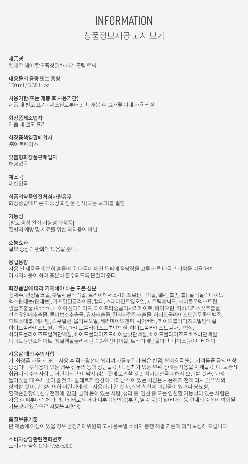 [TENZERO] Anti-Hair Loss CICA Cooling Tonic. 뿌리는 두피 영양제, 탈모 증상 완화 기능성 화장품.